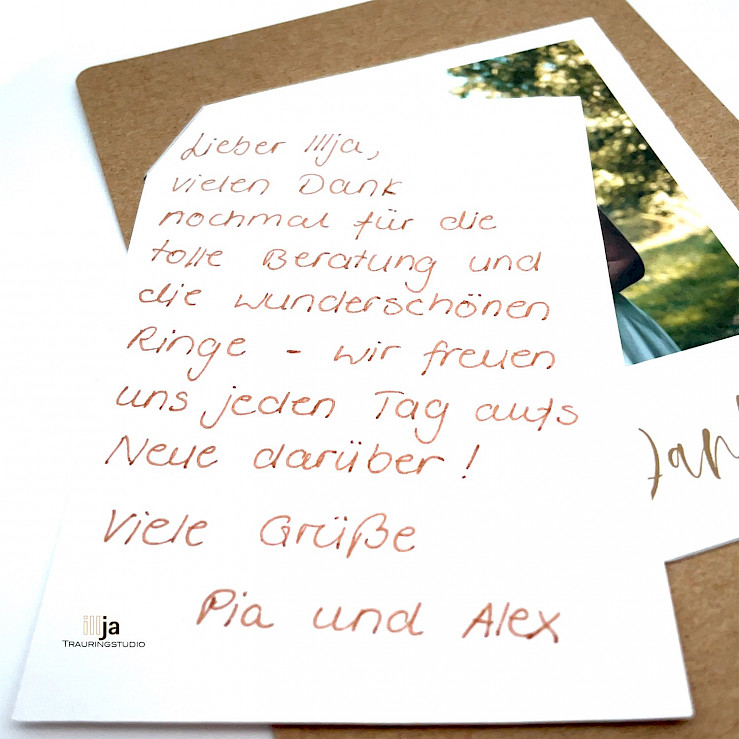 Lieber Illja, vielen Dank nochmal für die tolle Beratung und die wunderschönen Ringe - wir freuen uns jeden Tag aufs Neue darüber ! Viele Grüße Pia und Alex