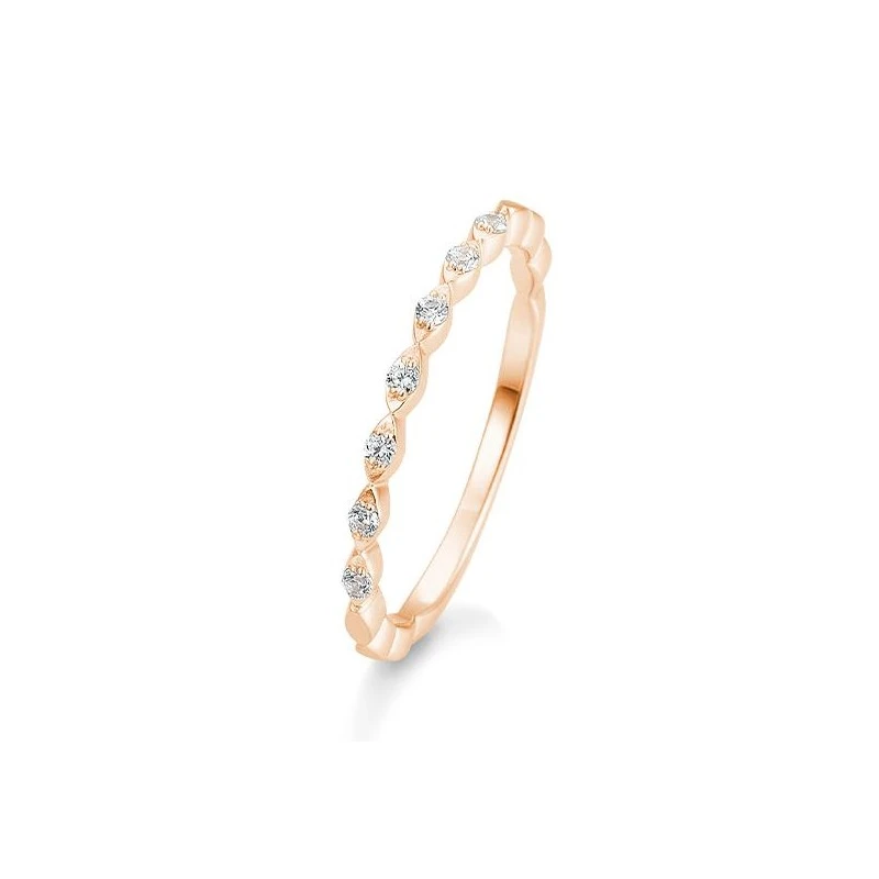 Breuning Memoire Ring Fantasy Kordeldesign in 585 Roségold besticht durch 7 Brillanten mit einer Gesamtkaratanzahl von 0,105ct. Jeder Diamant weist die Qualität H/SI auf, was für kleine Einschlüsse und die Farbe Weiß (Wesselton) steht. Der Schliff der Steine ist als sehr gut bewertet, was eine hohe Lichtreflexion und Brillanz verspricht.