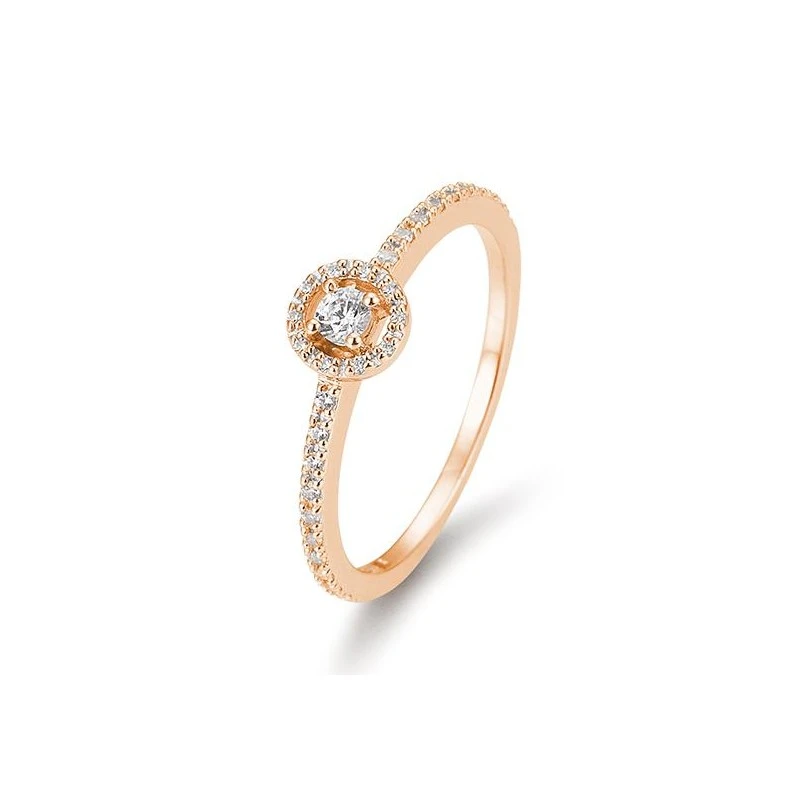 Breuning Fantasy Pavé Verlobungsring in 585 Roségold ist mit 31 Diamanten besetzt, darunter ein zentraler Brillant mit 0,08ct und insgesamt 0,22ct. Diese Steine weisen eine Reinheit von SI und die Farbe Weiß (Wesselton) auf, ergänzt durch einen sehr guten Schliff. Dieser Ring vereint Qualität und Design, ideal für einen unvergesslichen Antrag.