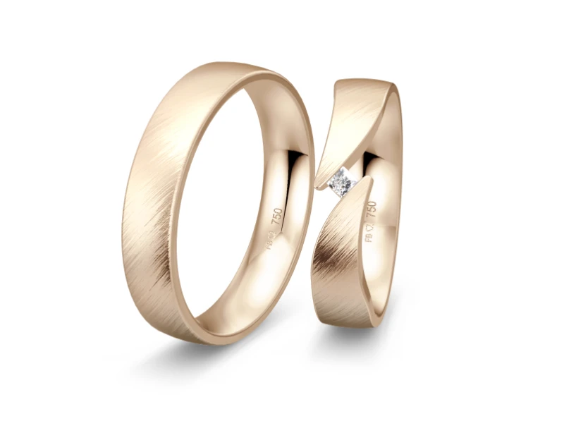 Die „Prinzessin“ Trauringe von Breuning zeichnen sich durch ihre feine Eleganz und königliche Anmut aus, gefertigt aus exquisitem 750er Gold Blush. Beide Ringe haben eine Breite von 5,00 mm und eine Höhe von 2,00 mm, gestaltet in einer strichmatt diagonalen Oberfläche, die das Licht subtil bricht und einen sanften Glanz erzeugt.