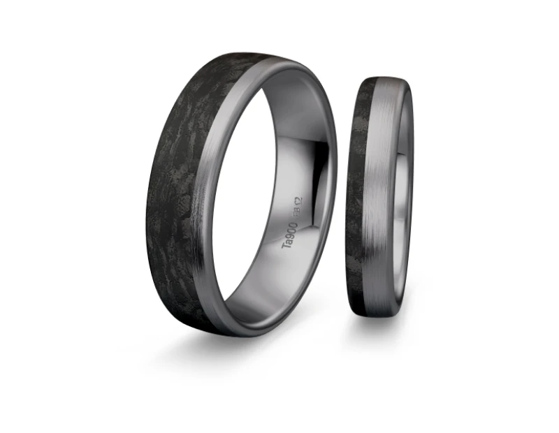 Beide Ringe sind frei von Edelsteinen, was ihre schlichte Eleganz betont und den Fokus auf das seltene und wertvolle Material Tantal legt. Die Kombination aus Carbon und Tantal verleiht den Ringen eine außergewöhnliche Optik und Haptik, die sie zu einer perfekten Wahl für Paare macht, die Wert auf Haltbarkeit und Design legen.